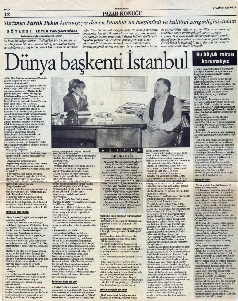 Cumhuriyet Gazetesi – Turizmci Faruk Pekin karmaşaya dönen İstanbul’un bugününü ve kültürel zenginliğini anlattı / 8 Haziran 2003